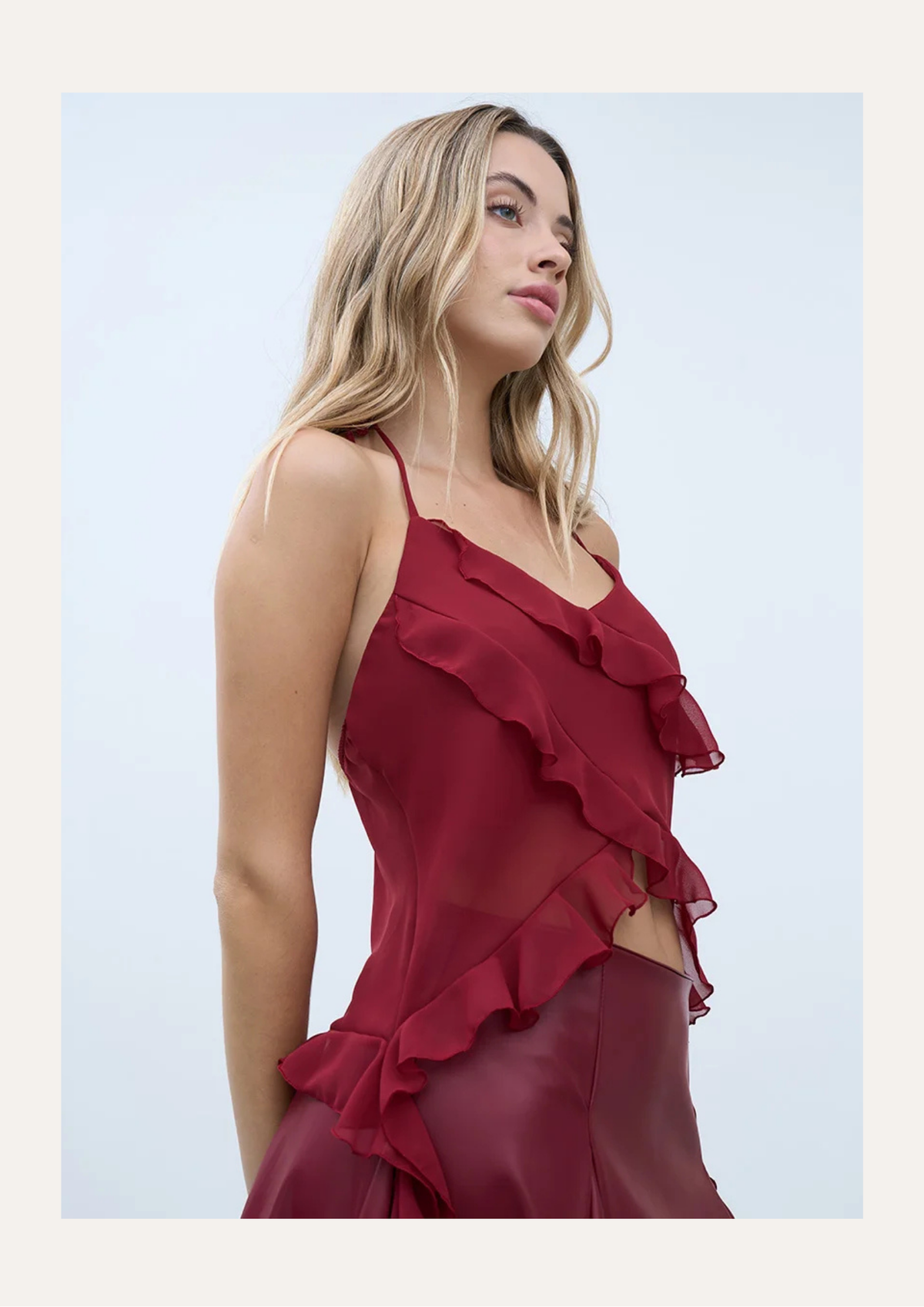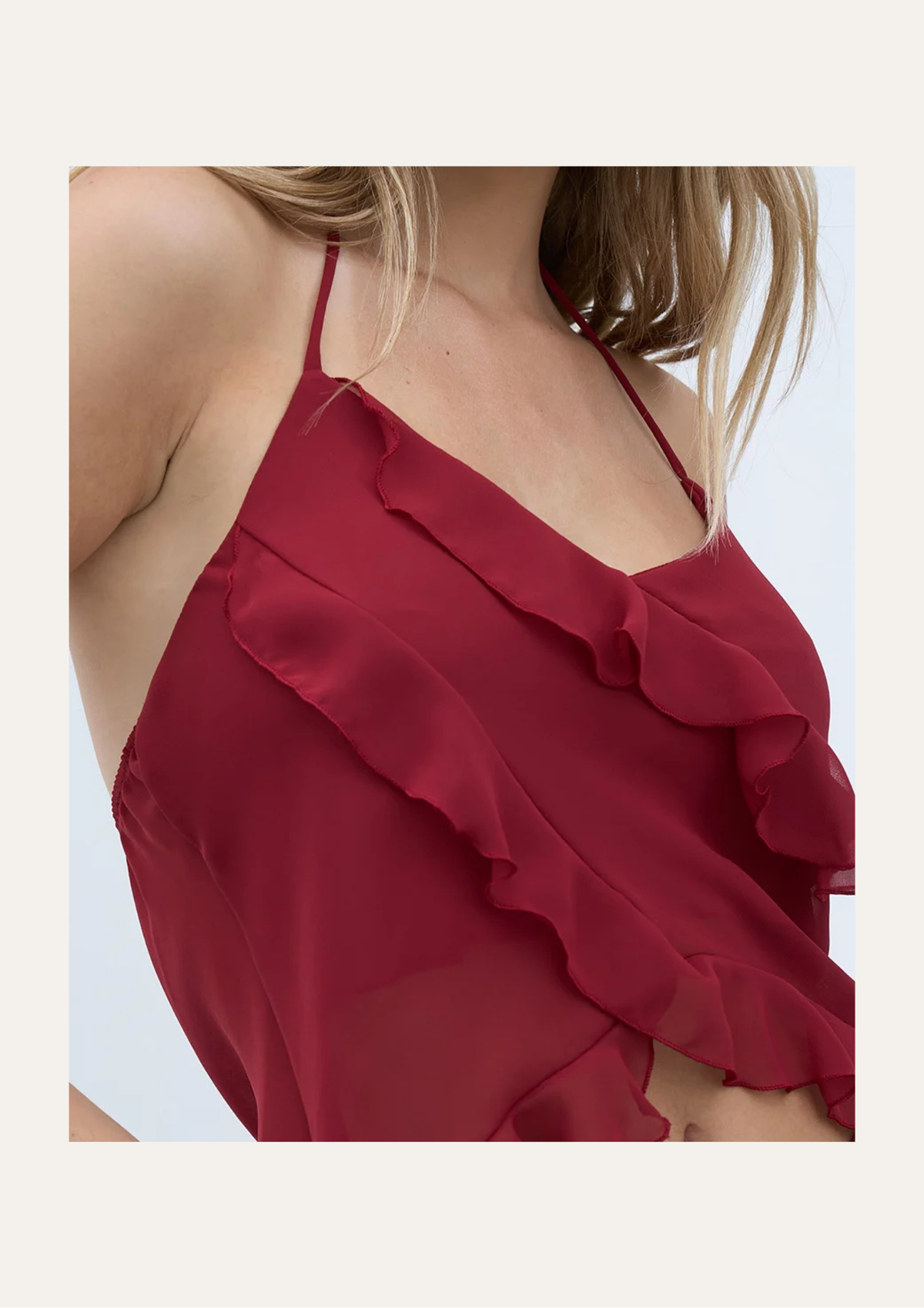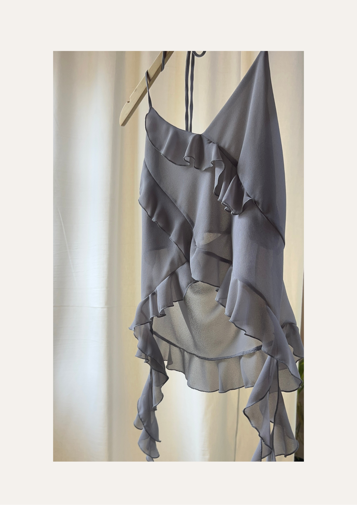 Top de gasa con volados en diagonal (cruzado) que continúan hasta la cadera. Tiene elástico de 1 cm en la espalda para un mejor calce y breteles ajustables a gusto. Tiene doble capa a la altura del busto para que sea mas denso la trasparencia.