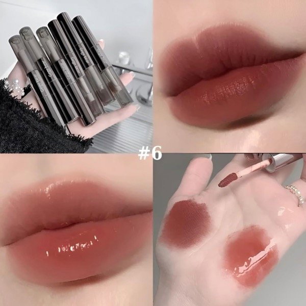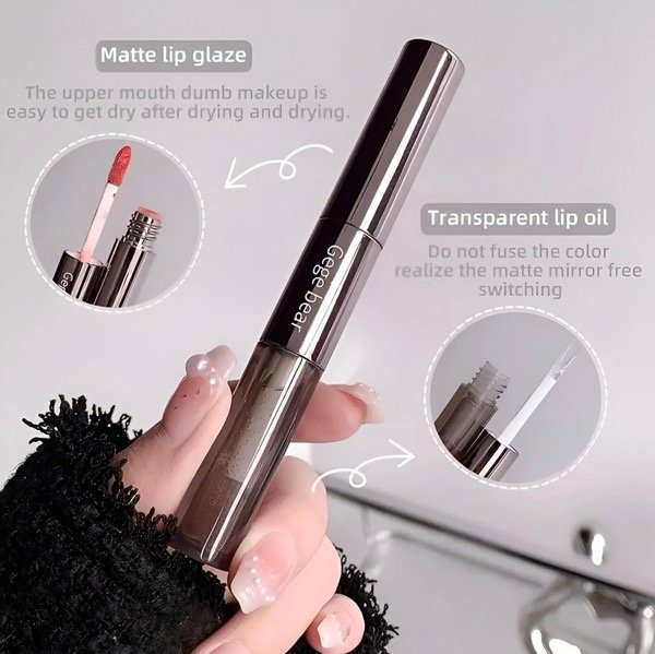 Un labial súper práctico que combina color matte suave + aceite gloss transparente en un solo envase. El lado matte ofrece un acabado aterciopelado, liviano y de larga duración, mientras que el gloss transparente suma brillo, volumen y confort sin alterar el color.